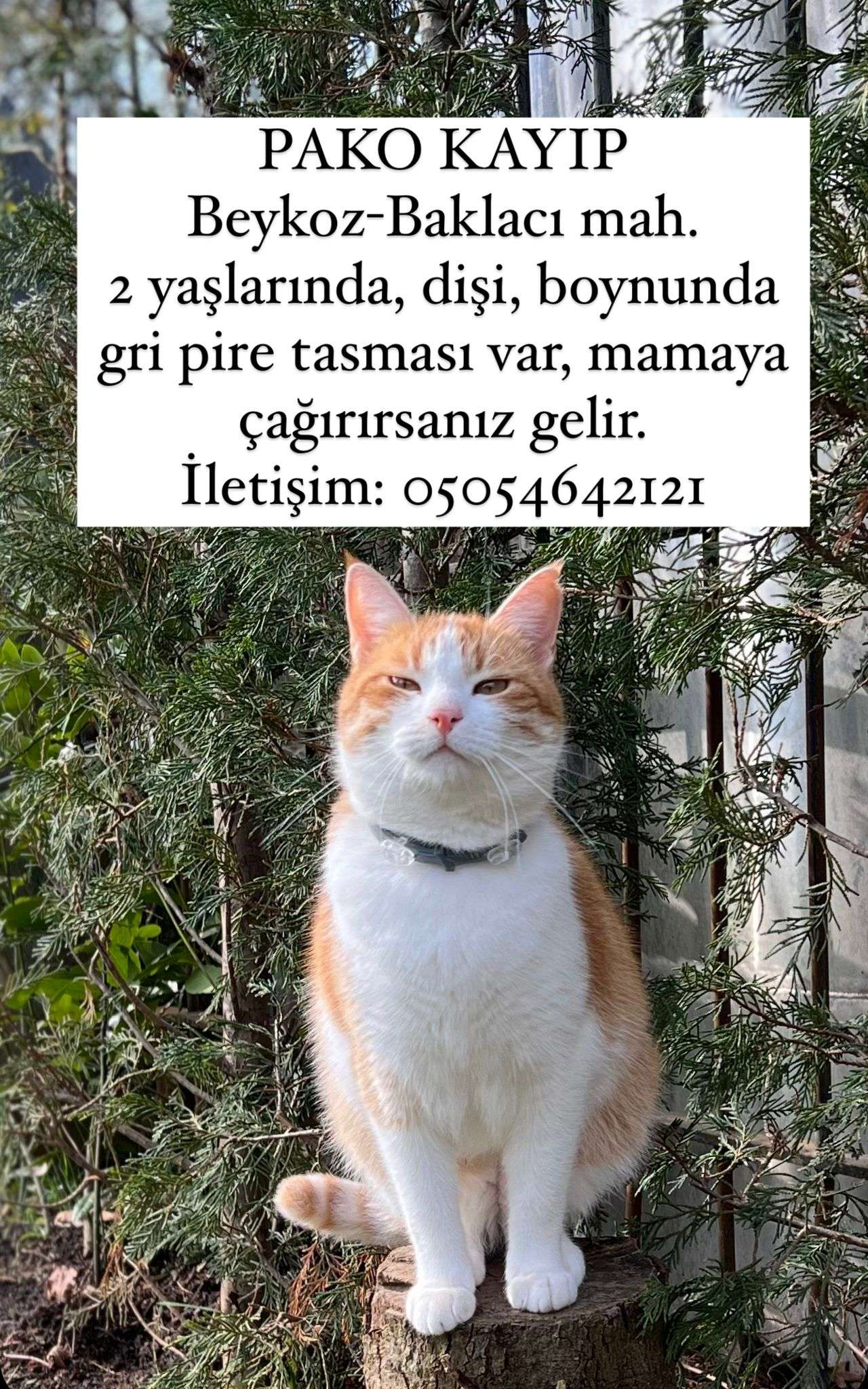 2 YAŞLARINDA DİŞİ KISIR BOYNUNDA GRİ PİRE TASMASI VAR, SOL KULAĞI KESİK, MAMA İÇİN ÇAĞIRINCA GELİR.