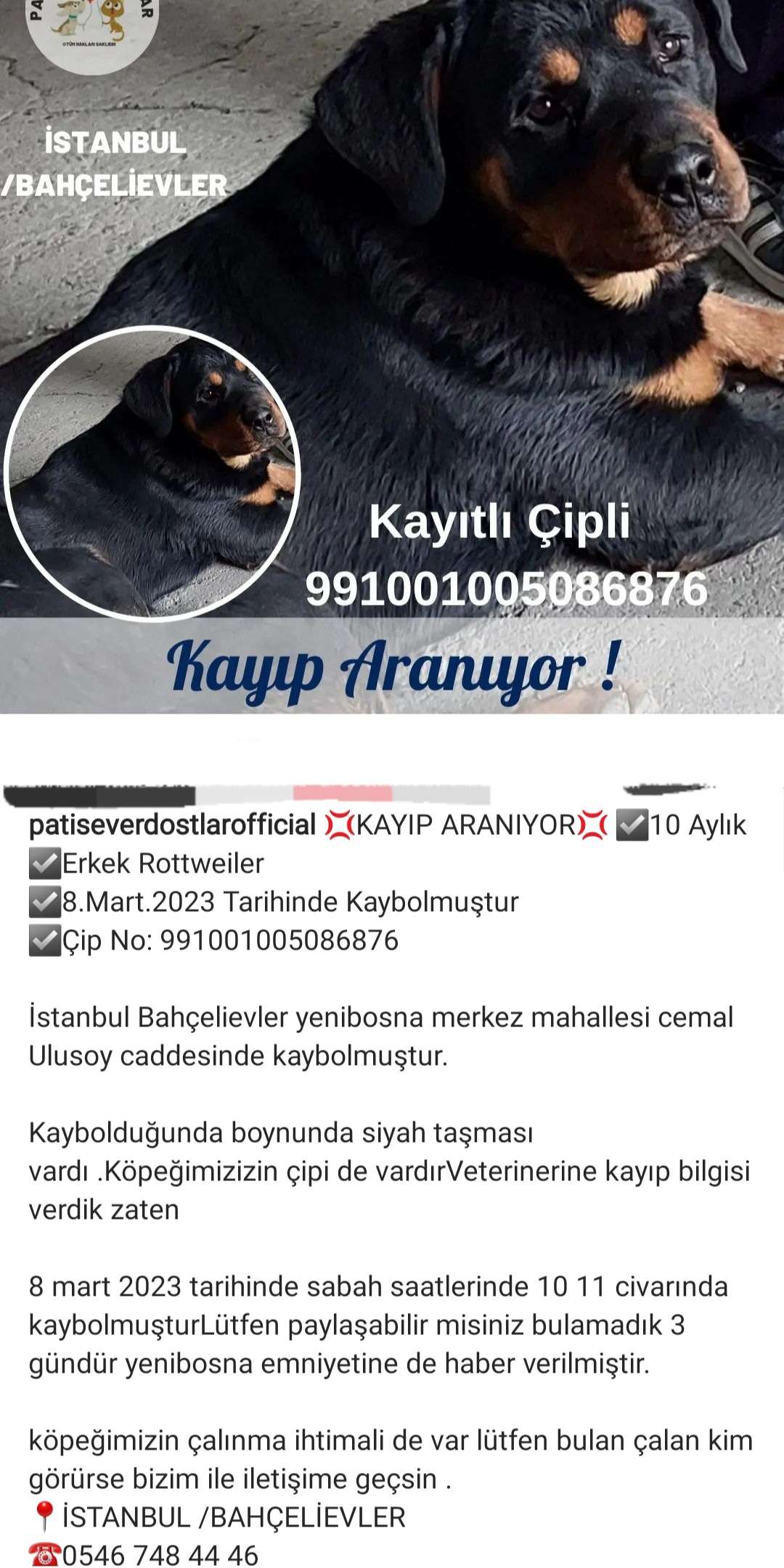 8 mart çarşamba günü sabah saatlerinde kaybolmuştur 10 aylık erkek insan dostu bir köpektir