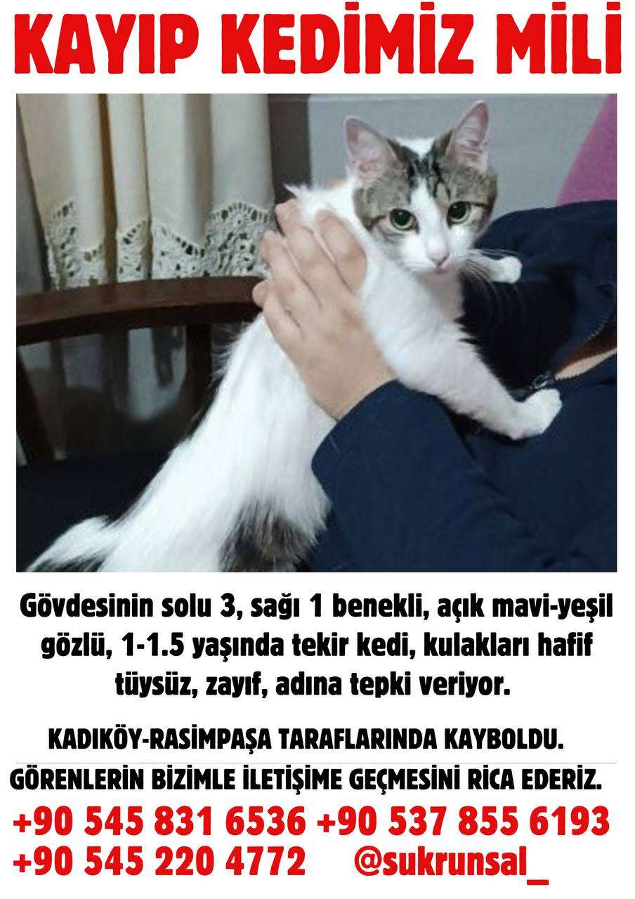 9 Haziran Pazartesi günü öğlen saatlerinde Rasimpaşa Mahallesi, Macit Erbudak sokak yakınlarında evden kaçtı. Yabancılardan korkan biraz saldırgan bir kedi. Kendi ismine tepki veriyor. Genelde tutmak kolay. Arkadaşımızın kedisi olduğu için bulunması biraz acil.