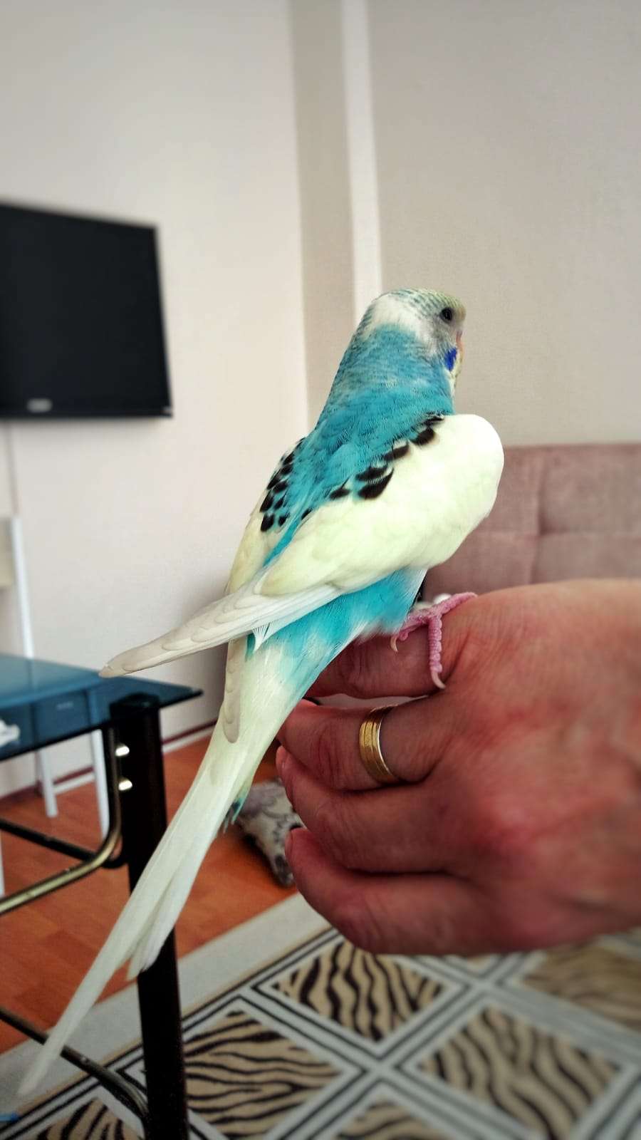 Rengi Turkuaz, kafası sarı, gövdesi beyaz. Söylediği kelimeler: çakır, paşam, cicikuş, aşkım, babacık.