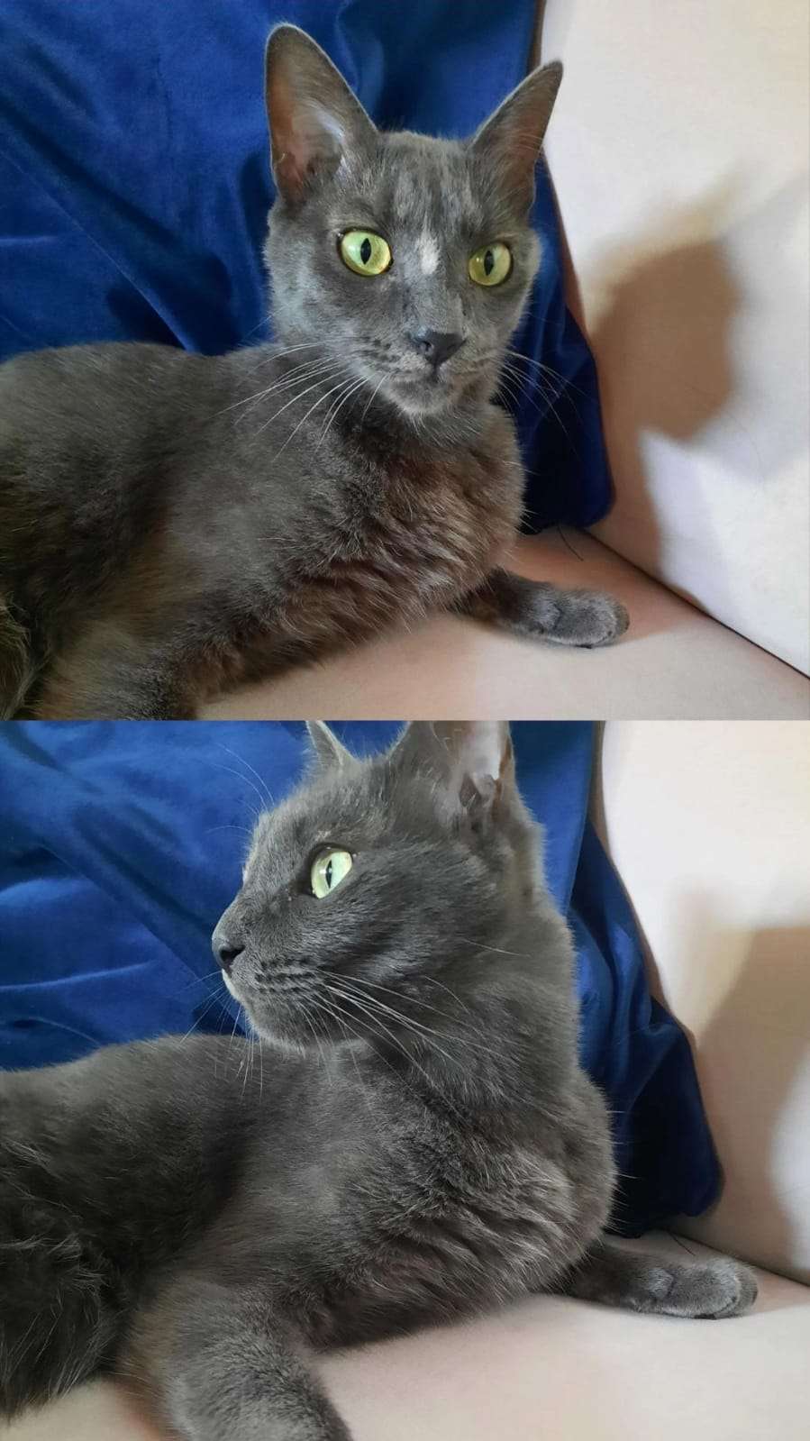 12 ağustos Cuma günü Beşiktaş'ta Ihlamurdere'de bulduk. Panik halde oradan oraya koşturuyordu. İnsana çok alışık veteriner Russian Blue olduğunu söyledi. Çok sevecen, çok sakin bir kız. Gri renkli, alnında biraz beyazlık var.