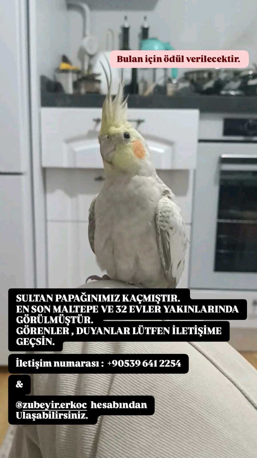 sultan papağanımiz bayram kaybolmuştur bizim için manevi değeri çok yüksek çok üzgünüz bulana para ödülü verilecektir