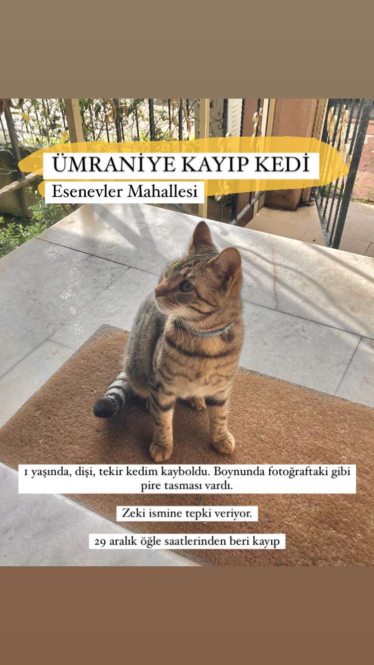 29 Aralık öğle saatlerinden beri kayıp. 1 yaşında, dişi, tekir kedi. Boynunda gri pire tasması var. Zeki ismine yanıt veriyor. Çenesinin altındaki beyazlıktan tanıyabilirsiniz. Esenevler mahallesi.