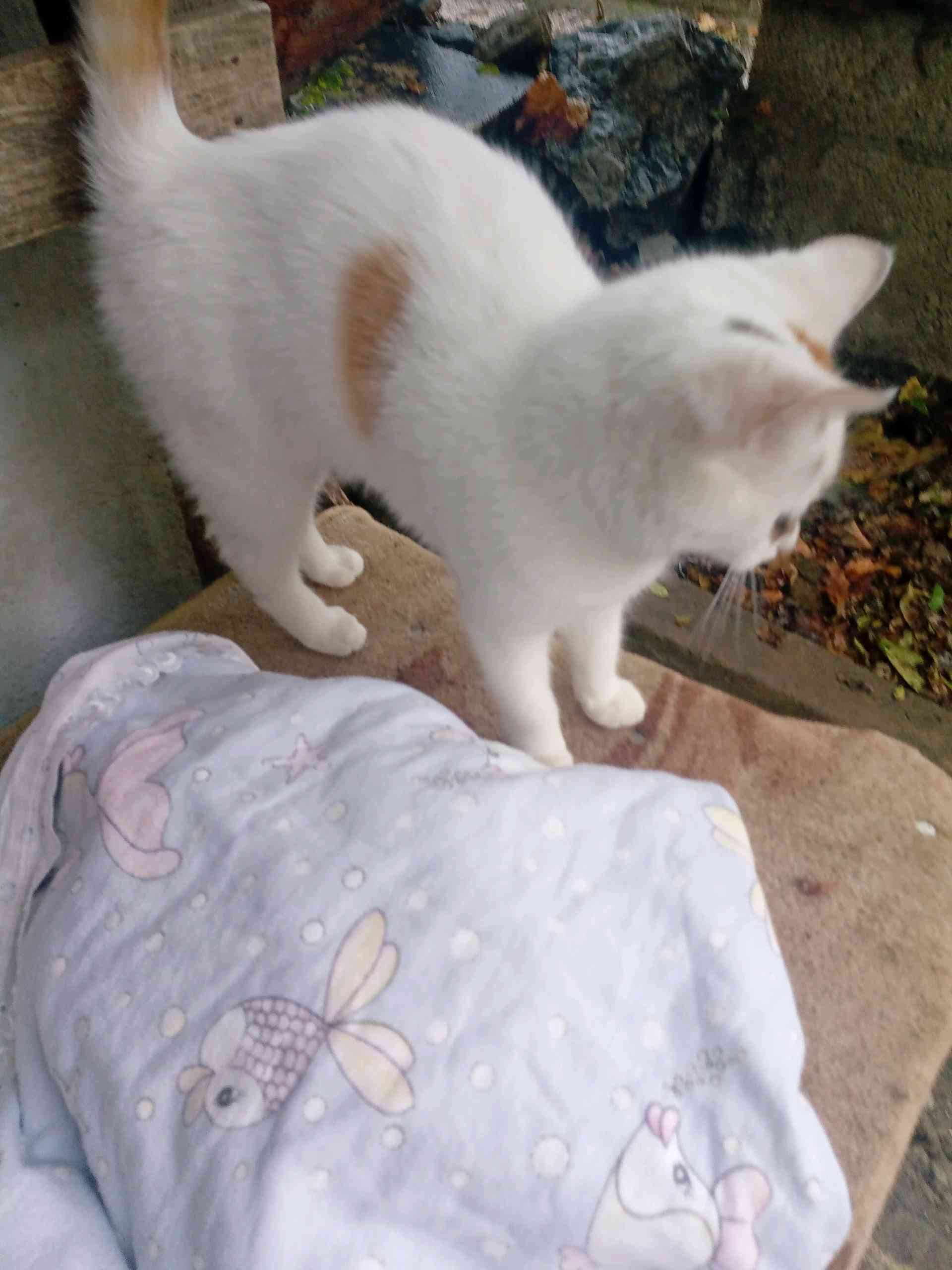 kapıma battaniyeye sarılı bir biçimde bir kedi terk edildi. beyaz ve dişi olan bu kediyi sahiplenecek birilerini arıyorum.