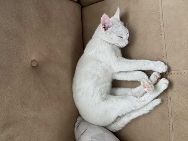 Bir gözü yeşil bir gözü mavi-yeşil beyaz kedi. Evde bakılıp bırakılmış. Çok uysal,insancıl ve tuvalet terbiyesi var. Erkek.